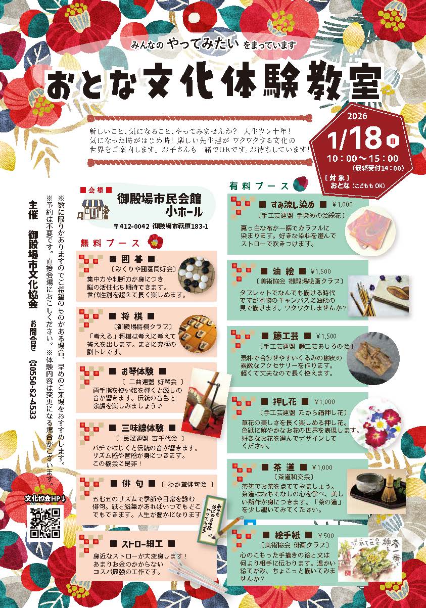 出前講座を申し込み頂けます。 お申し込みは御殿場市文化協会にて承ります。